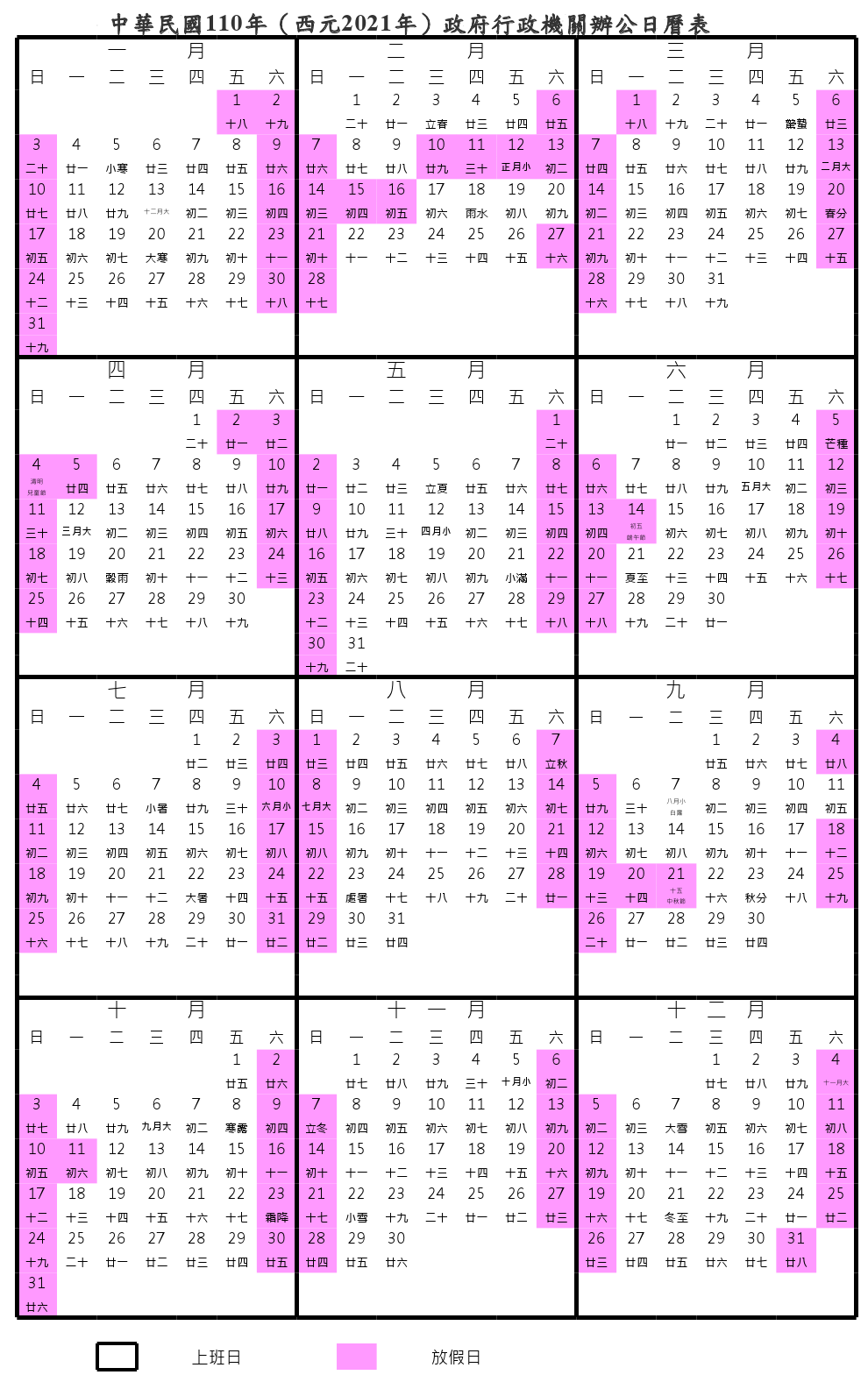 民國110年 西元2021年 行事曆
